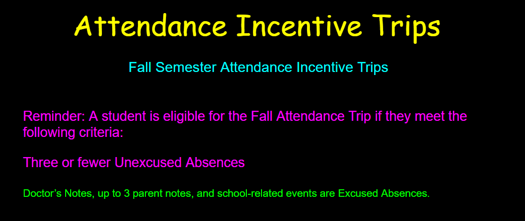 For the Fall Semester, students who are eligible for the Attendance Incentive in Junior High and High School will be attending a celebration party on December 15th.